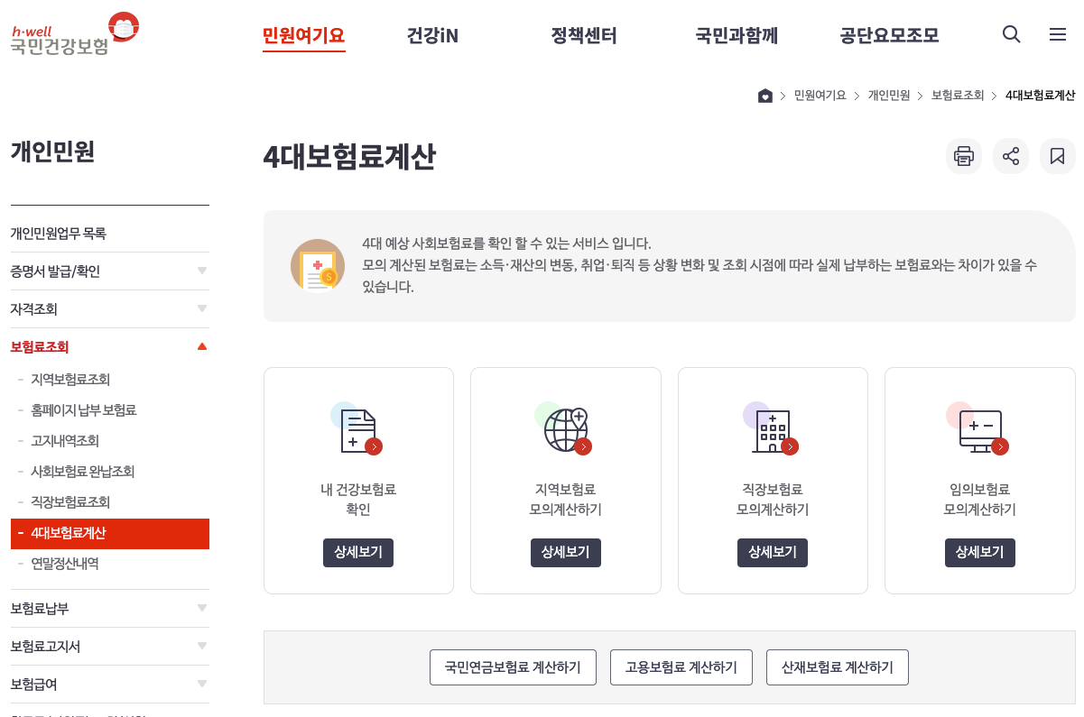 건강보험료를 일일이 계산하기에는 복잡한 부분이 있기에, 건강보험공단에서 건보료계산 서비스를 운영하고 있습니다. 내 건강보험료 확인 / 지역보험료 모의계산사기 / 직장보험료 모의계산하기 / 임의보험료 모의계산하기 뿐만아니라 국민연금보험료 계산하기 / 고용보험료 계산하기 / 산재보험료 계산하기 등도 이용 가능합니다.