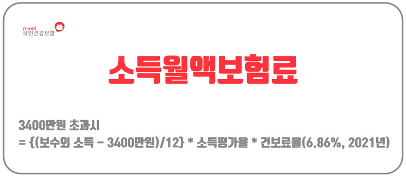 소득월액보험료는 3400만원을 초과하는 보수외 소득에서 3400만원을 빼고 이를 12로 나눠서 소득평가율의 100%를 곱한 후, 건강보험료 6.86%를 곱해서 산출합니다.