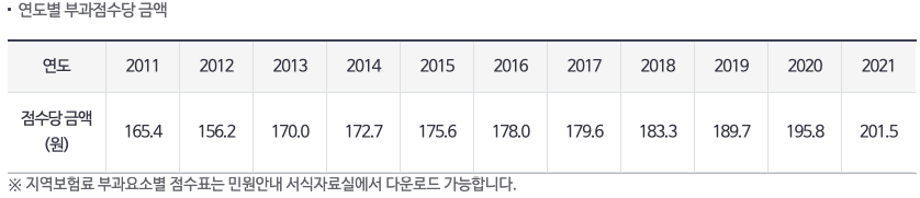 지역가입자의 보험료는 소득, 주택/건물/토지 등의 재산, 자동차 등에 등급을 매기고 점수를 부여해서 산출합니다. 점수당 금액도 꾸준히 올라서 현재 점수당 201.5원을 내고 있습니다.