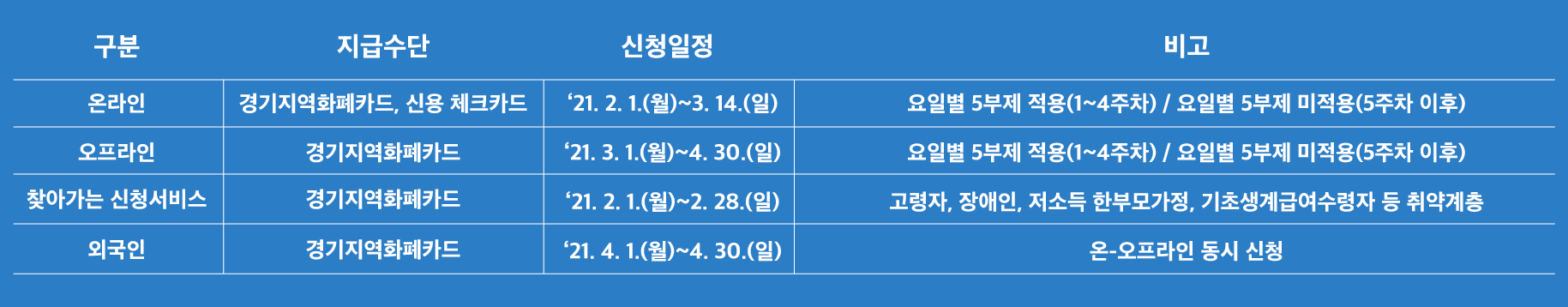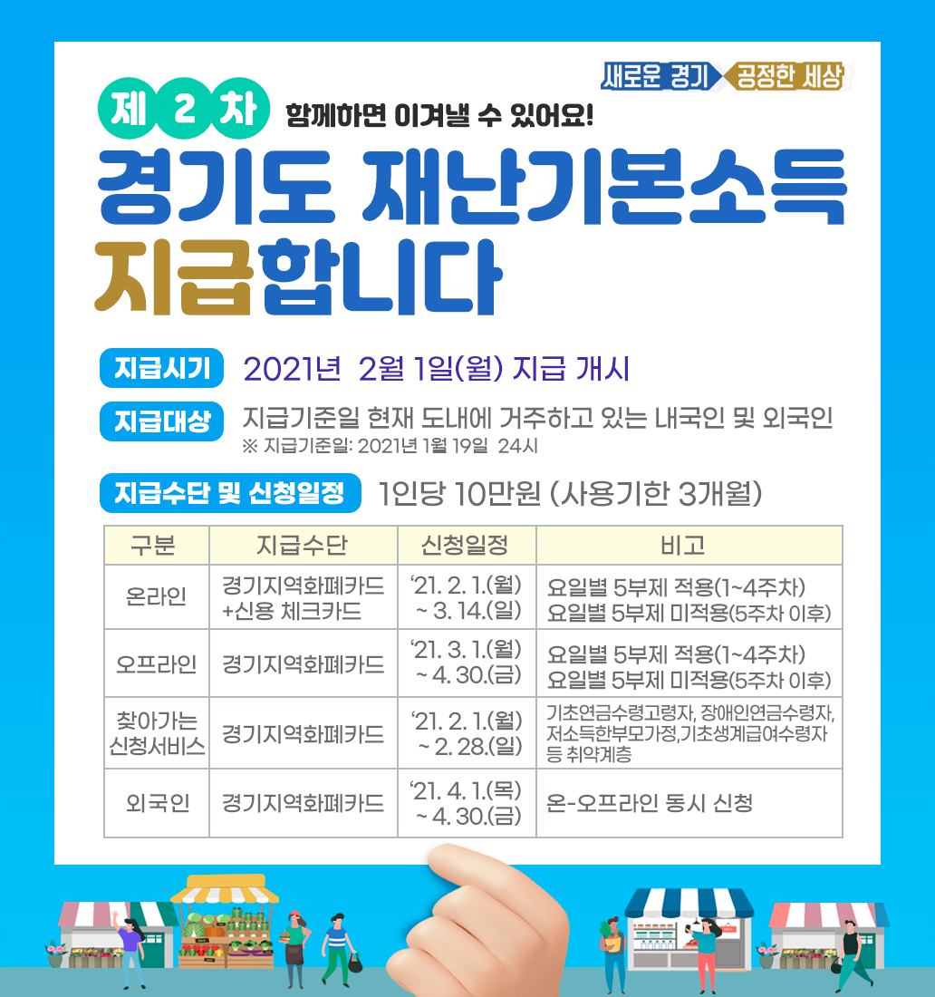 2월 1일부터 4월 30일까지 제2차 경기도 재난기본소득 신청기간입니다. 신청방법은 온라인, 오프라인, 찾아가는 서비스, 외국인 신청으로 나누어지며 각각 신청기간이 다르기 때문에, 경기도민이라면 미리 알아두셔야 하겠습니다. 지급수단은 온라인의 경우, 경기지역화폐카드와 신용/체크카드로 지급되고, 다른 신청방법은 경기지역화폐카드로만 지급됩니다. 이 밖에 알아두어야 하는 사항이 있으니 차근차근 짚어보도록 하겠습니다.