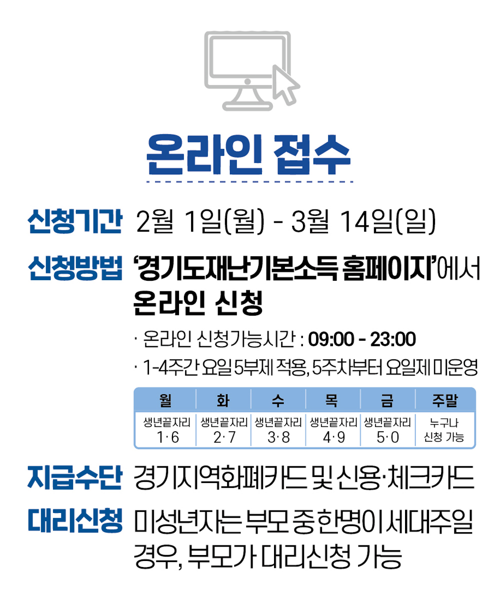 경기도는 코로나19 확산 방지를 위해 가급적이면 온라인으로 신청하길 당부한다고 합니다. 온라인은 2월 1일부터 3월 14일 까지 PC 또는 모바일로 경기도 재난기본소득 홈페이지(basicincome.gg.go.kr)에 접속해 신청할 수 있습니다.