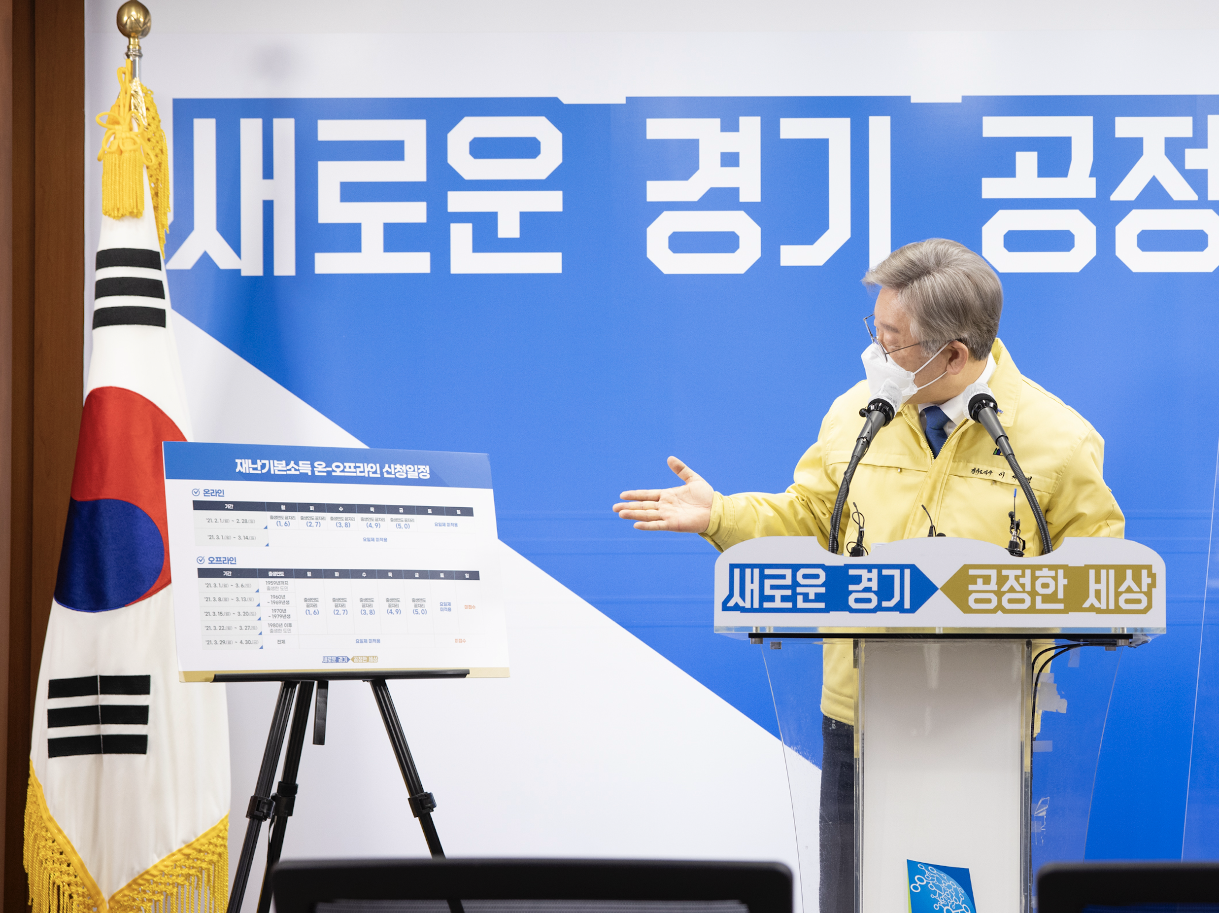 이재명 경기도지사가 28일에 전 경기도민에 10만원씩 재난소득을 지급하겠다고 밝혔습니다. 이재명 지사는 온라인 기자회견을 통해 "방역과 경제 등 현재의 모든 여건을 고려할 때 3차 대유행의 저점에 도달한 지금, 설 명절 전에 재난기본소득을 지급하는 것이 바람직하다는 결론을 내렸다"고 밝혔습니다. 지급대상은 경기도에 주민등록을 둔 도민 1천 399만명이며, 외국인(등록외국인, 거소신고 외국국적동포) 58만명도 포함됩니다. 지급신청은 2월 1일부터 4월 30일까지 신청을 받습니다.(온라인 신청: 2월 1일 ~ 3월 14일 / 오프라인 신청: 3월 1일 ~ 4월 30일)