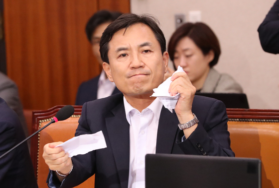 이미 식은지 꽤 된 김일성 가면 논란을 법사위 과정에서 들고 나와 색깔론 공세를 펼쳤다. 김진태 의원은 김일성 젊은 시절 사진과 북한 응원단이 사용한 가면 사진을 가져와 비교하며 조명균 통일부 장관에게 김일성 가면이 맞냐고 물어보았다. 조 장관이 아니라고 하자 성질을 부리며 김일성이 아니니까 사진을 찢어도 되냐고 되물었다. 그러라고 하자 사진을 찢는 모습을 보였다. 질문 내내 조명균 통일부 장관에게 공격적인 말투로 '북한 대변인', '이 양반'이라고 호칭하였고 자신을 비웃은 거냐며 성질을 부려, 국회의원으로서 부적절한 모습을 보인다는 비판을 받았다.