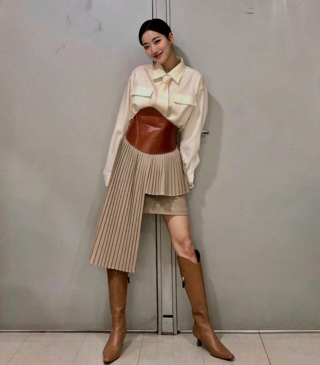 아이보리 컬러 블라우스에 가죽 소재 벨트+언발란스 기장의 스커트에 미디 기장 브라운 부츠 매치했네요.