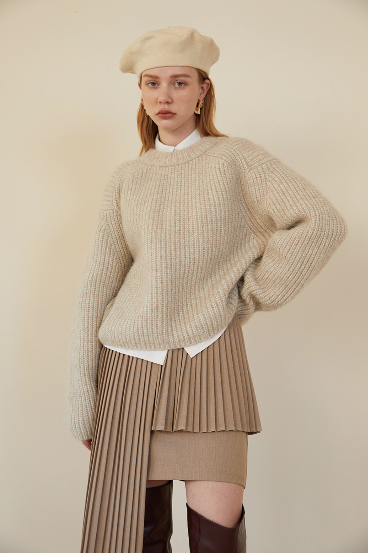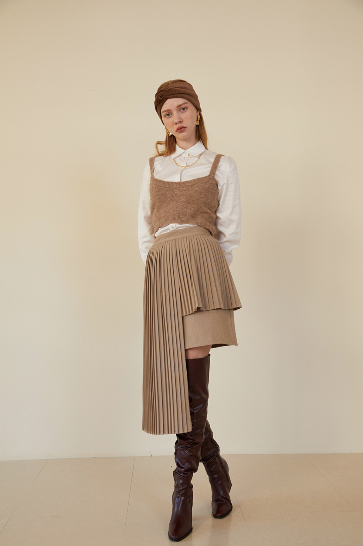 나은님이 착용한 스커트는 FREI HEIT(프라이하잇)의 UNBAL PLEATS SKIRT (CARAMEL BEIGE) 입니다.