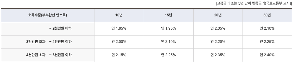 대출금리는 대상의 부부합산 연소득에 따라 아래와 같이 나뉩니다.