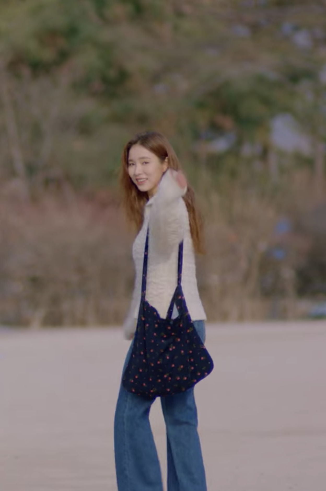 신세경님은 흰 티셔츠에 아이보리 컬러 반집업 니트+와이드 진청 데님+플라워패턴 에코백 착용했어요.