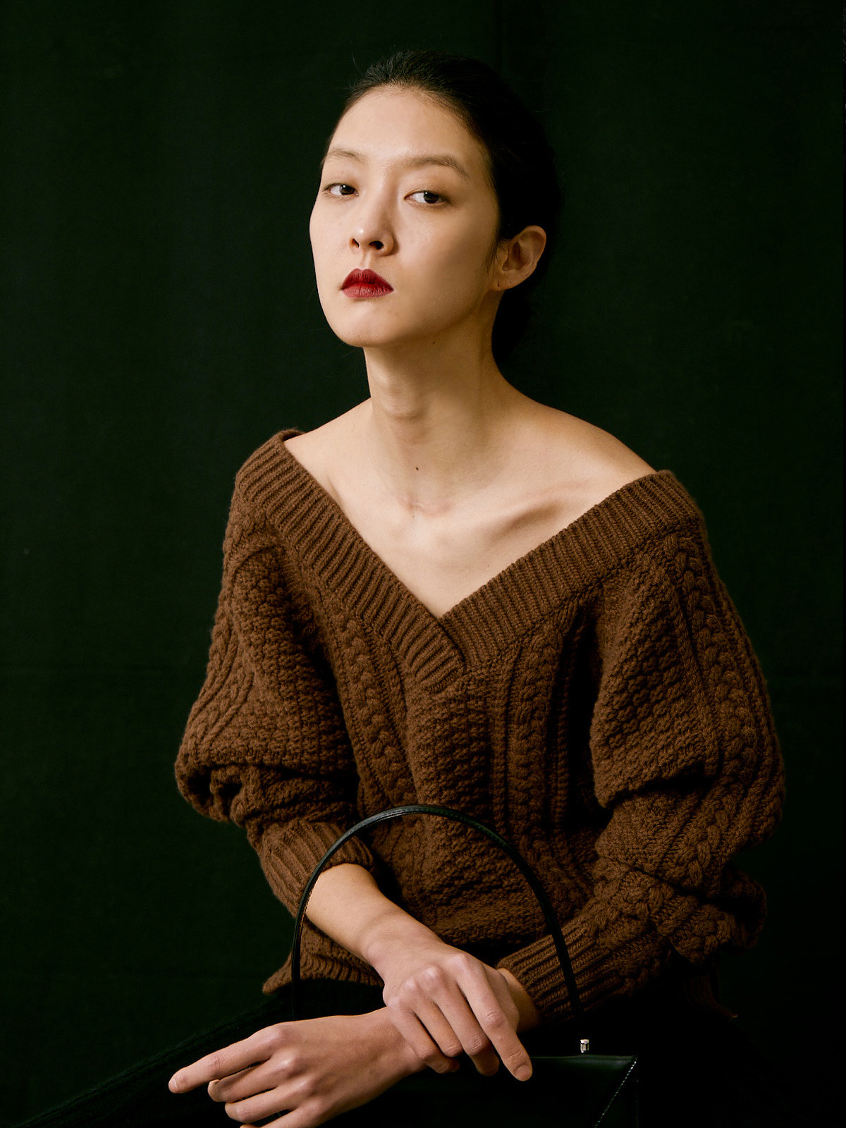 V-NECK CABLE KNIT WOOL SWEATER (BROWN)