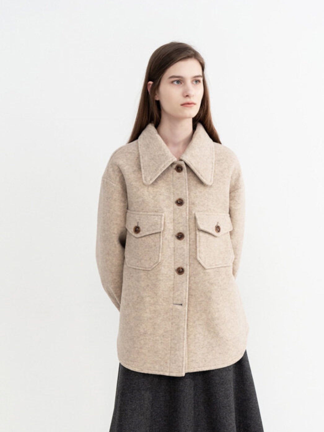 워크웨어 스타일의 아우터는 AVA MOLLI(아바몰리)의 MELANGE WOOL BONDING COAT, OATMEAL 색상이에요.