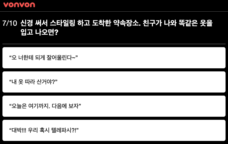 7. 신경 써서 스타일링 하고 도착한 약속장소. 친구가 나와 똑같은 옷을 입고 나오면?