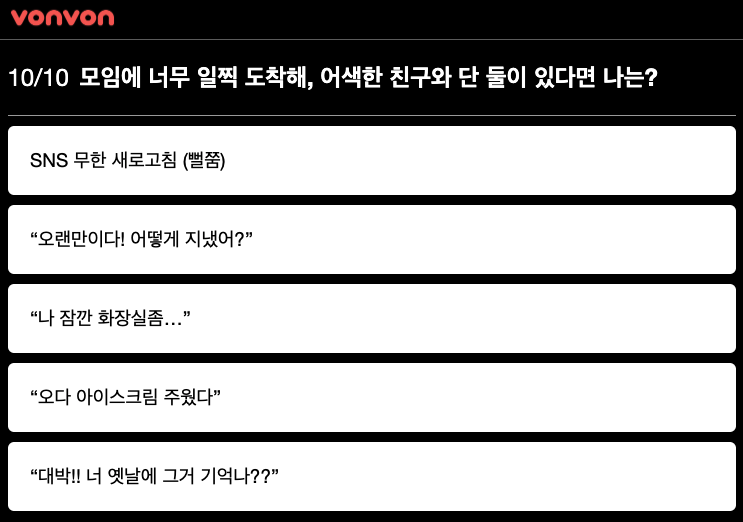 10. 모임에 너무 일찍 도착해, 어색한 친구와 단 둘이 있다면 나는?