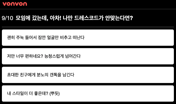 9. 모임에 갔는데, 아차! 나만 드레스코드가 안맞는다면?