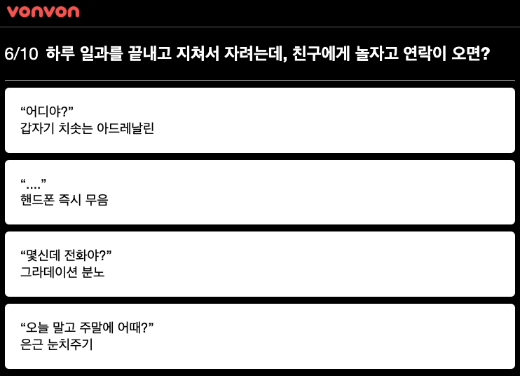 6. 하루 일과를 끝내고 지쳐서 자려는데, 친구에게 놀자고 연락이 오면?