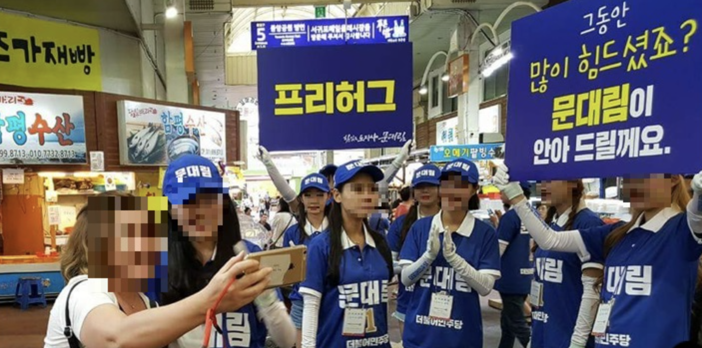 2018년 6월 4일 제주지사 선거에서 문대림 측 여성 선거운동원 4~5명이 서귀포의 한 시장에서 '그동안 많이 힘드셨죠, 문대림이 안아드릴게요'란 피켓을 들고 지원 유세를 했다. 이들은 지나가는 행인들을 안아줬고 그 장면이 지역 언론에 보도됐다.