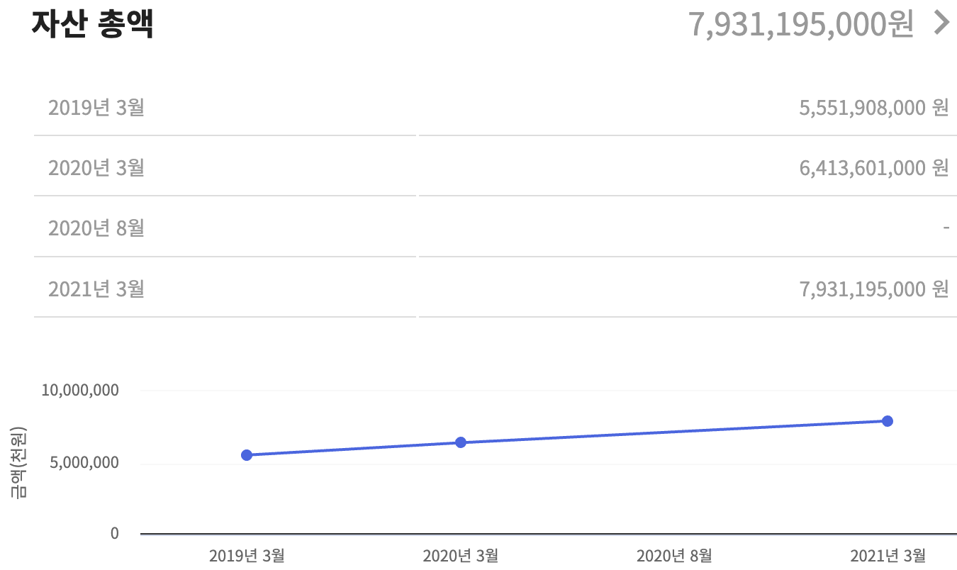 2021년 3월 기준 79억 3119만 5천원을 신고했다. 이는 전년도 대비 15억 가량 증거한 금액이다.