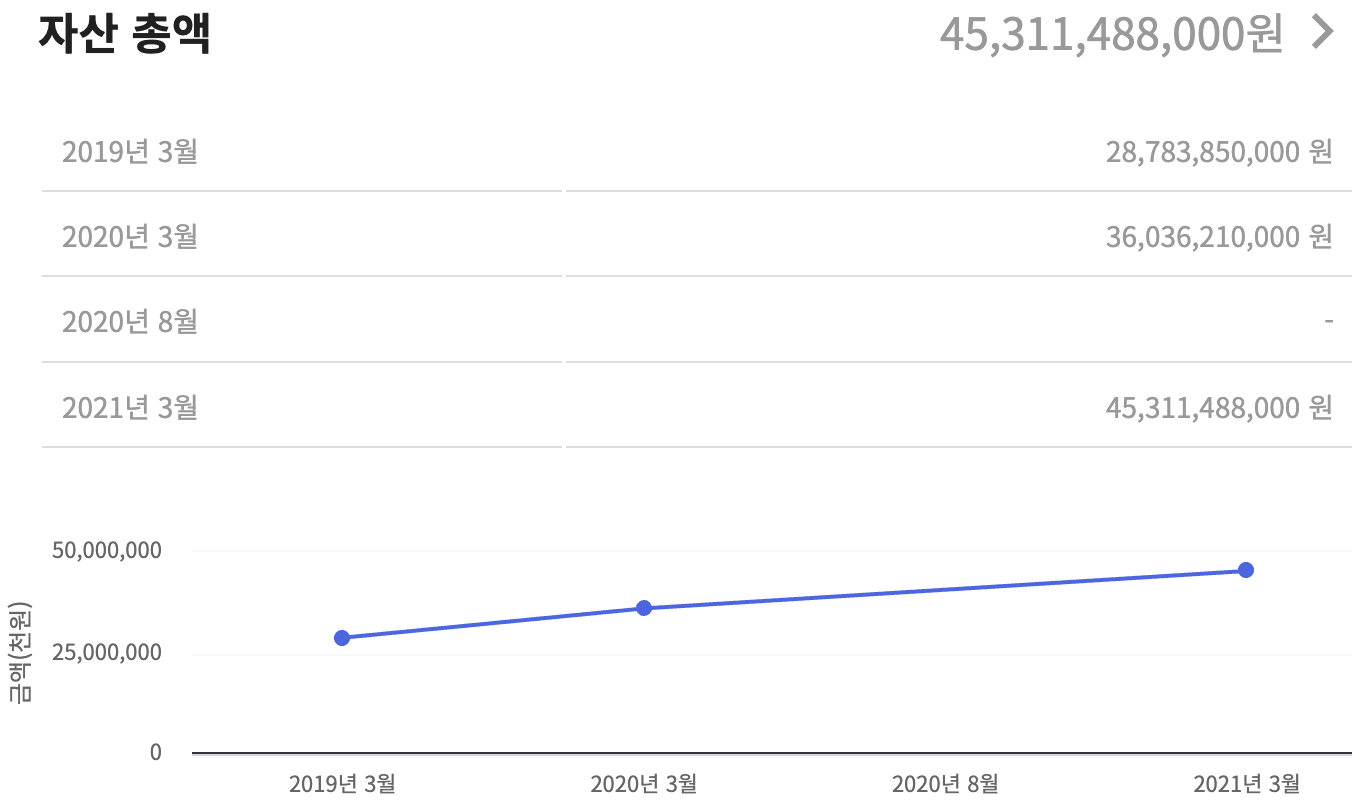 2021년 3월 기준으로 453억 1148만 8천원을 신고했다. 이는 전년도 대비 90억원 가량 증가한 금액이다.