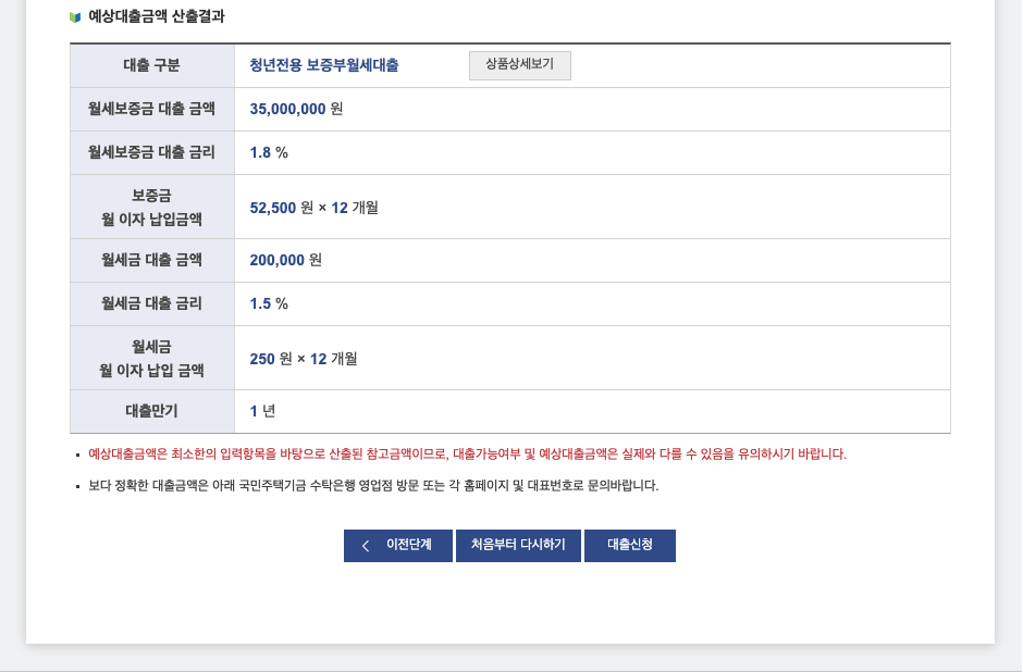 대출상품종류로는 청년전용 보증부월세대출이, 예상대출금액으로는 3천 5백만원 희망대출 전액이 나왔습니다. 대출금리는 1.8%를 적용받았습니다. 월세금 대출 금액은 20만원 전액에, 1.5% 대출금리가 나왔습니다.