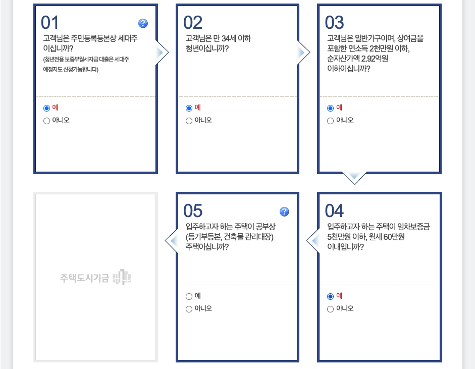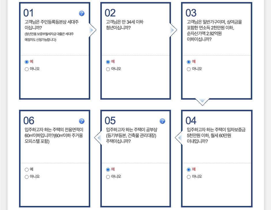다음 6개의 문항에 대해 해당사항을 체크하면 됩니다. 세대주 여부, 만 34세 미만 청년여부, 소득 등을 바탕으로 대출 자격을 확인하게 됩니다. 질문은 다음과 같습니다.