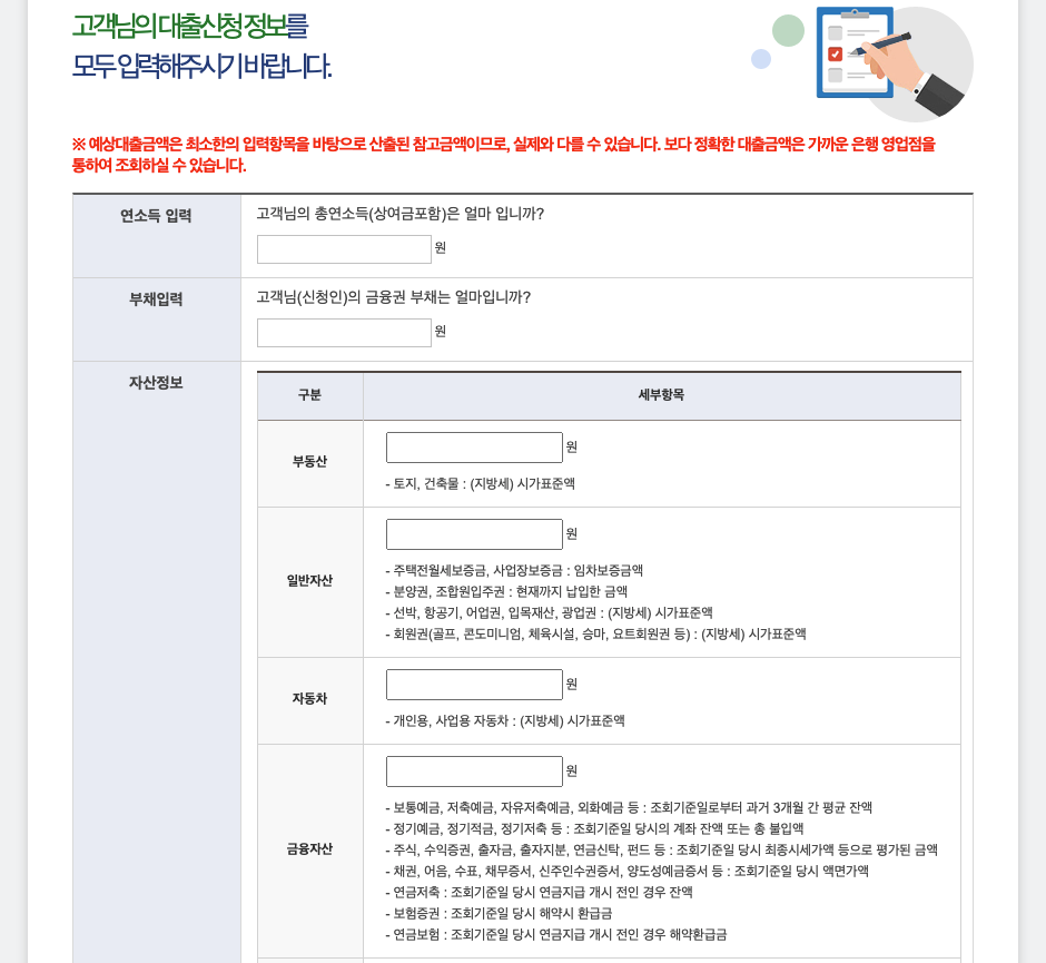 ※ 예상대출금액은 최소한의 입력항목을 바탕으로 산출된 참고금액이므로, 실제와 다를 수 있습니다. 보다 정확한 대출금액은 가까운 은행 영업점을 통하여 조회하실 수 있습니다.