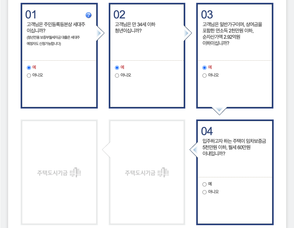 다음 6개의 문항에 대해 해당사항을 체크하면 됩니다. 세대주 여부, 만 34세 미만 청년여부, 소득 등을 바탕으로 대출 자격을 확인하게 됩니다. 질문은 다음과 같습니다.