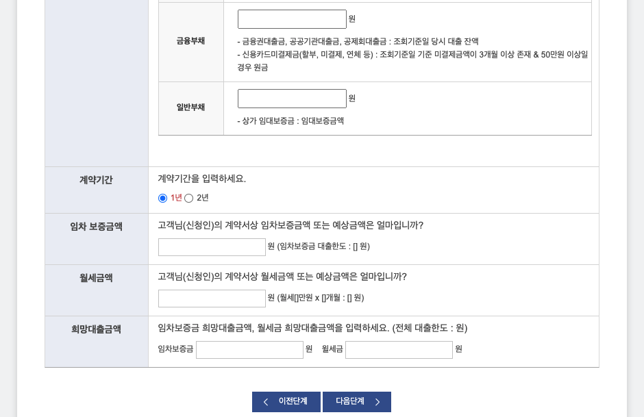 위의 연소득, 자산정보, 월세금액 등을 모두 입력 하셨으면 하단의 다음단계 버튼을 눌러 계속 진행합니다.