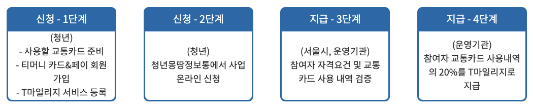 본 사업은 <2022년 서울시 청년 대중교통비 지원사업> 운영기관인 ㈜티머니에서 발행하는 티머니 선불교통카드(모바일티머니 포함)에서 사용한 교통카드 실적을 기반으로 마일리지를 지급합니다. 티머니 선불교통카드(모바일티머니 포함)가 없으신 경우 사업 참여가 어려우니 이 점 유의하여 주시기 바랍니다.