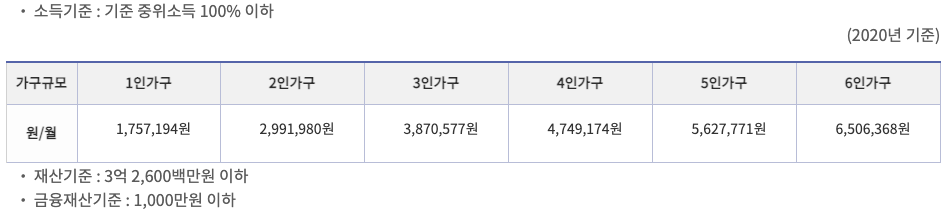 생계비: 1인 가구(30만원), 2인 가구(50만원), 3인 가구(70만원), 4인 이상가구(100만원)