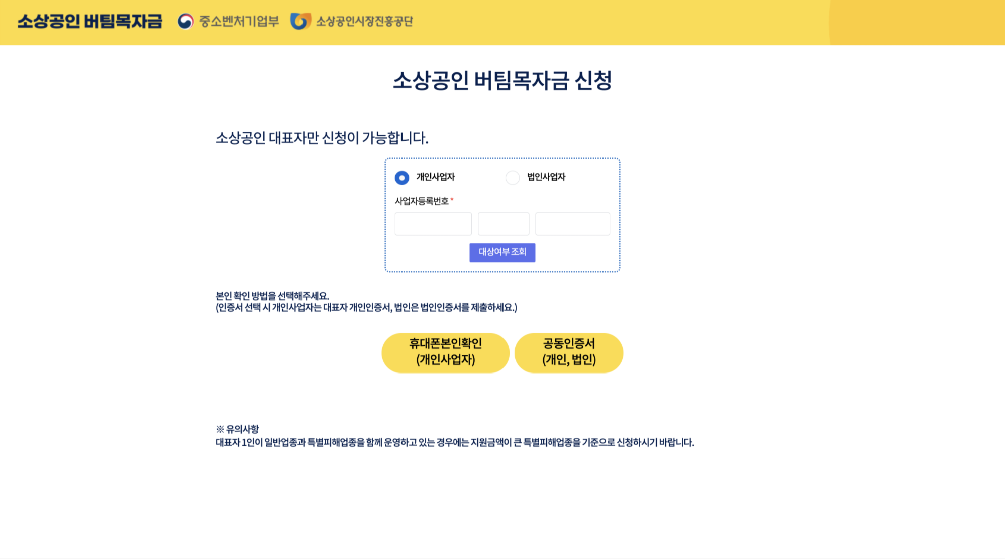 개인사업자는 휴대폰본인확인 또는 공동인증서로