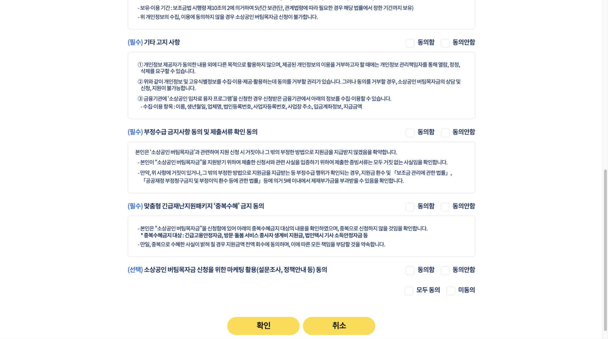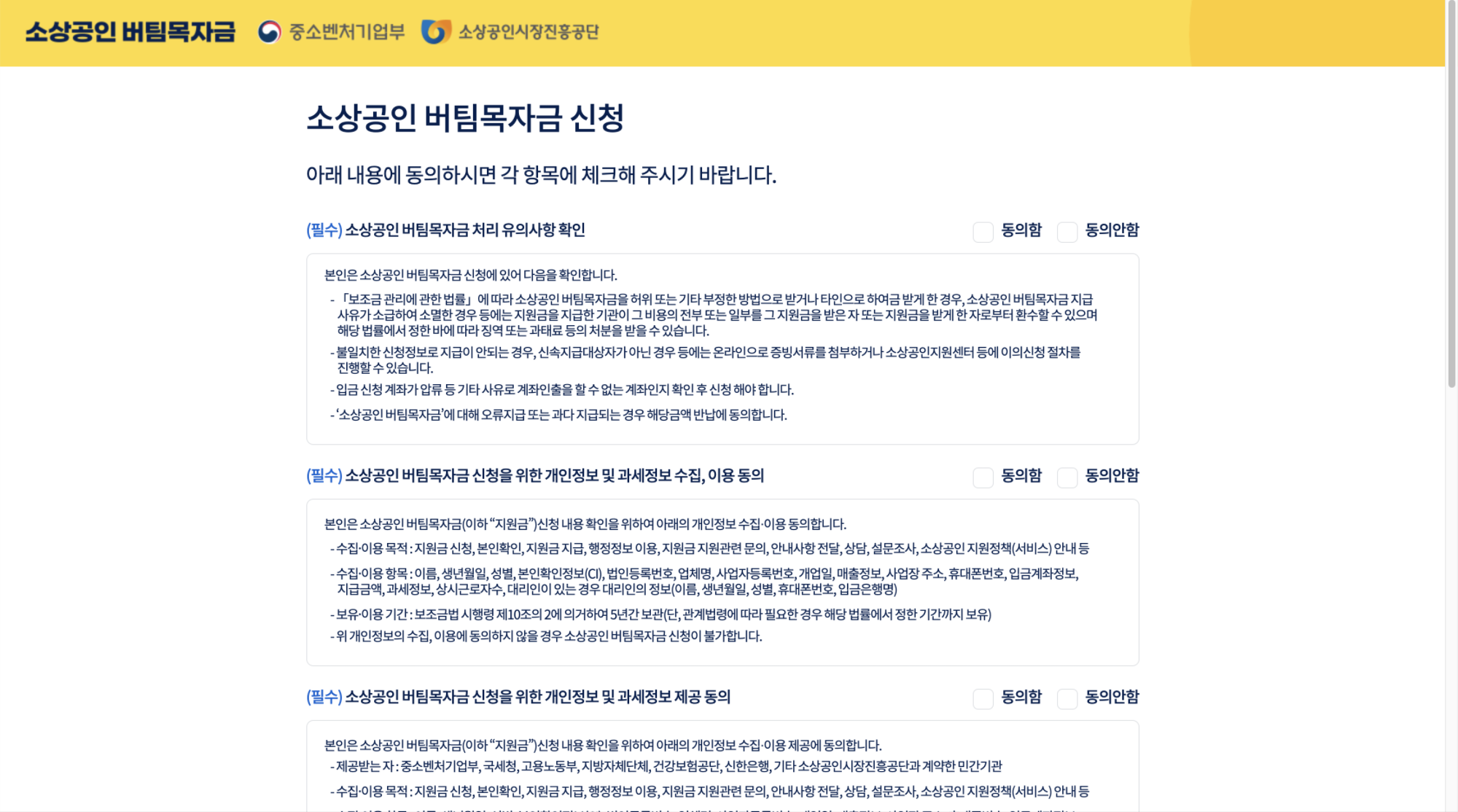 소상공인 버팀목자금 신청 화면으로 넘어가면 아래의 확인사항등을 체크하시고 동의를 해주셔야합니다.