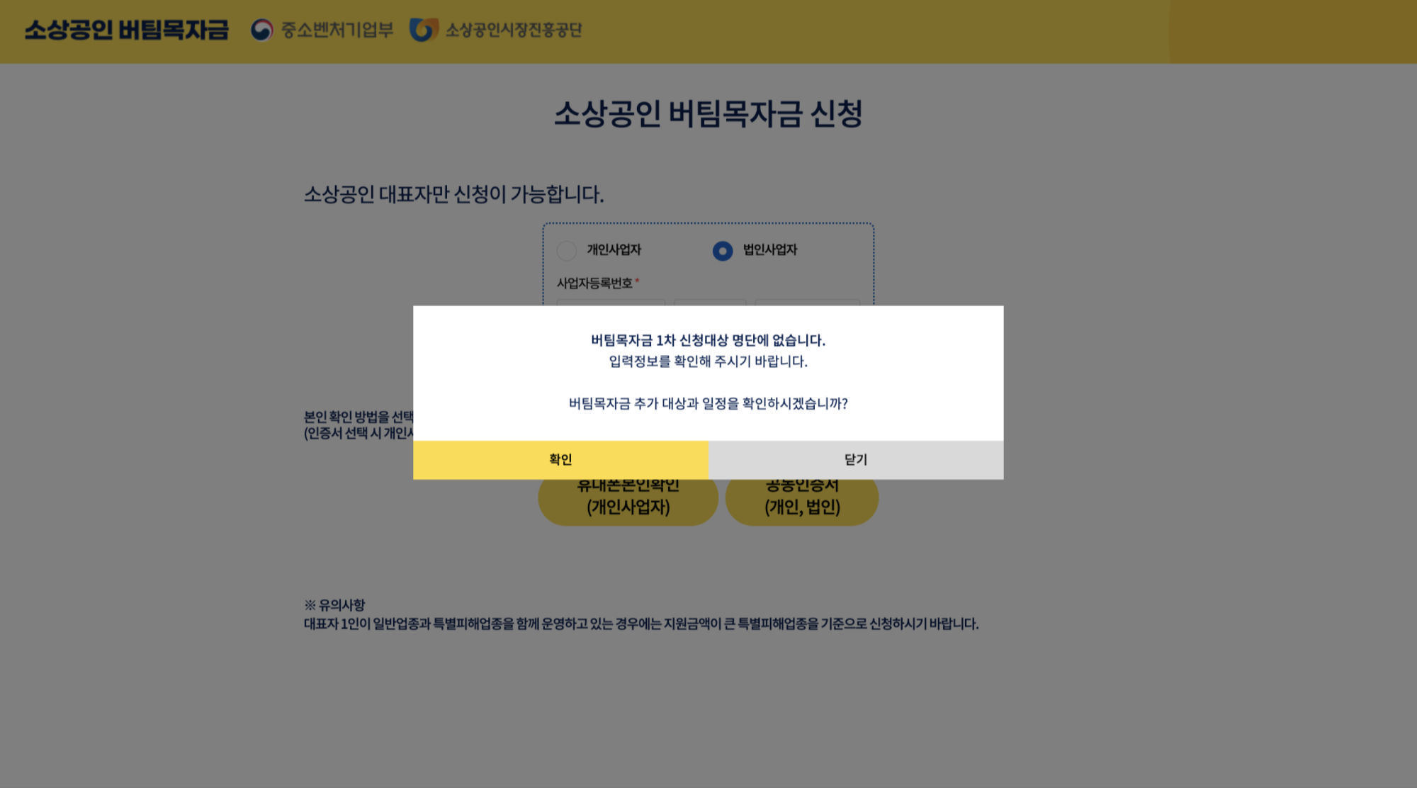 이번 버팀목자금 1차 신청대상이 아닌 경우, 조회 시 아래와 같이 '버팀목자금 1차 신청대상 명단에 없습니다. 입력정보를 확인해 주시기 바랍니다.'라는 문구의 팝업창이 뜹니다.