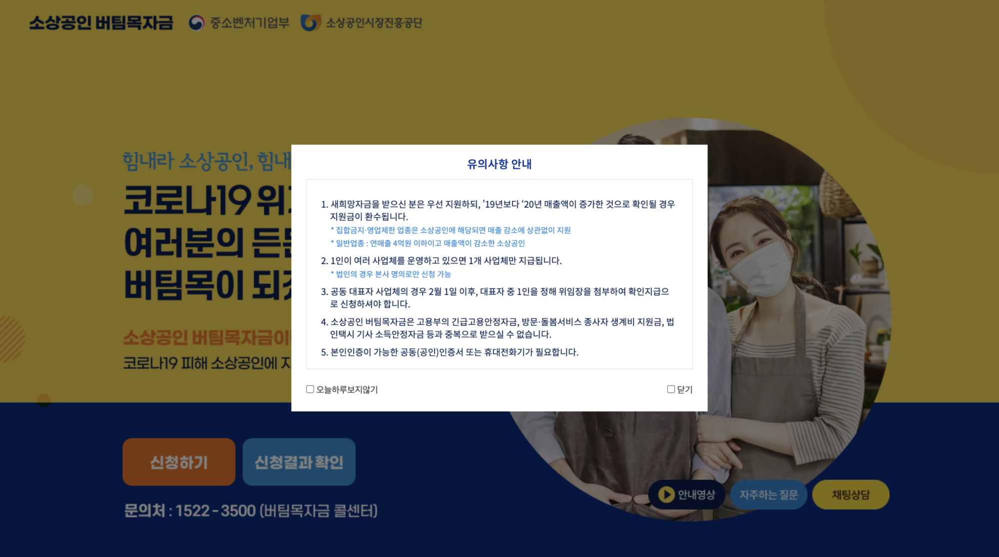 4. 소상공인 버팀목 자금은 고용부의 긴급고용안정자금, 방문/돌봄서비스 종사자 생계비 지원금, 법인태시 기사 소득안정자금 등과 중복으로 받으실 수 없습니다.