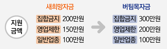 버팀목자금은 새희망자금의 큰 틀은 유지하되, 정부/지자체의 방역지침에 따라 집합금지/영업제한을 이행한 소상공인에 대하여 임차료 등 고정비용 경감 등을 목적으로 보다 두텁게 지원합니다.