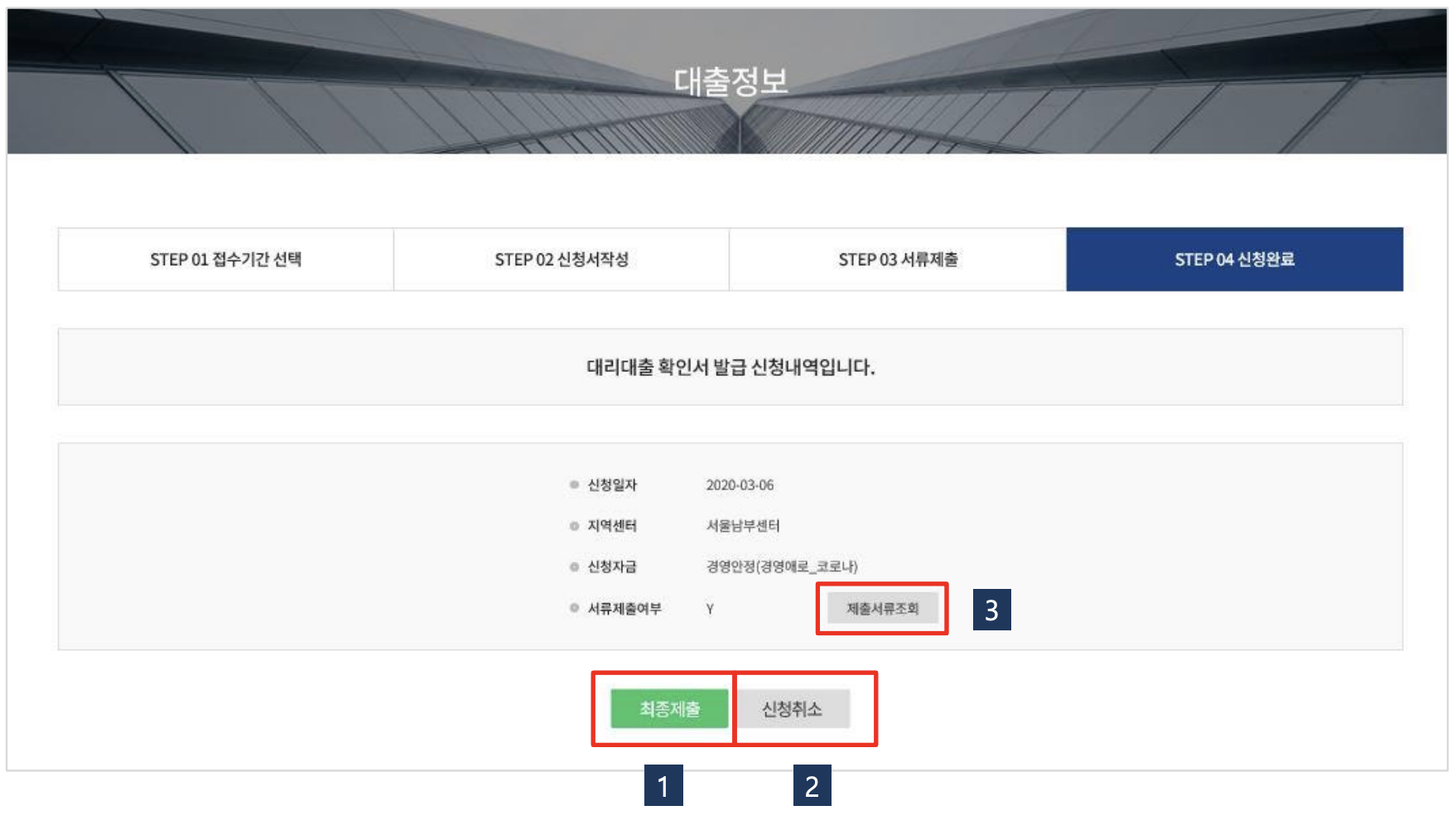 [신청서 보기], [서류보기], [최종제출] 등의 버튼을 통해 해당여부를 확인할 수 있습니다.