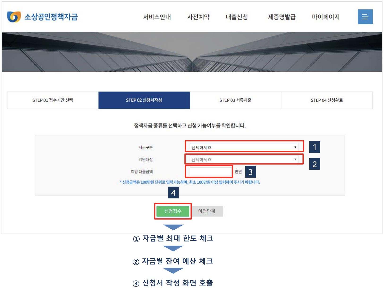 하단의 [신청접수] 버튼을 누르면 자금별 최대 한도 체크 - 자금별 잔여 예산 체크 - 신청서 작성 화면 호출 순으로 진행됩니다.