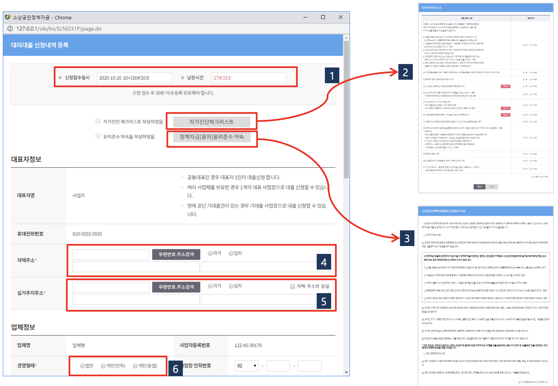 [자가진단체크리스트] 버튼을 눌러 대출불가사항에 "예"를 선택한 경우 신청서 작성이 진행되지 않습니다. 모든 질문에 체크하고 [확인]버튼을 클릭해서 완료합니다.