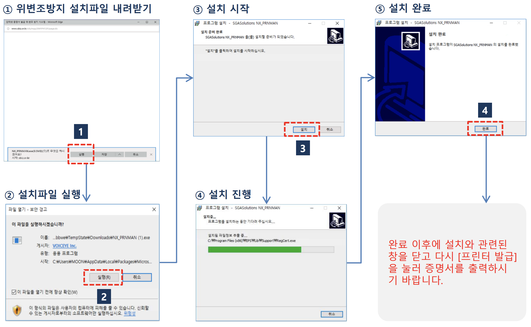 [확인서출력] 버튼을 클릭하면 위변조방지 설치파일 설치화면이 나옵니다. 아래 화면을 따라 설치해주세요.