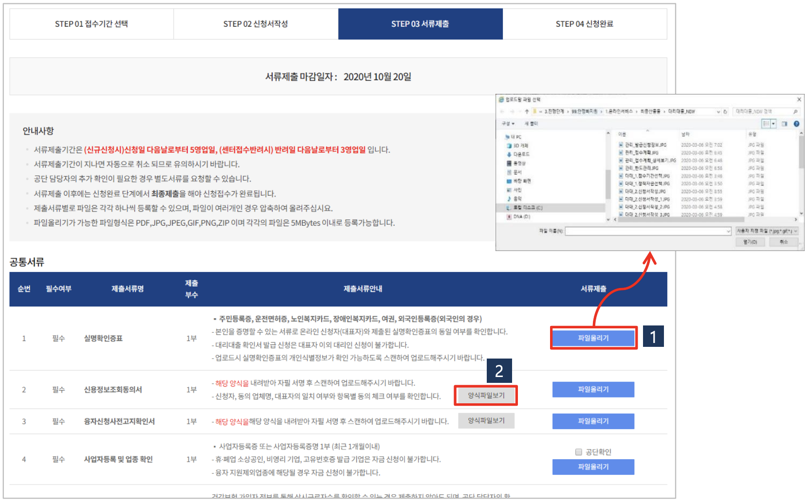 신용정보조회동의서 등의 [양식파일보기] 버튼이 있는 서류는 양식을 다운로드 한 후, 자필 서명을 하고, 스캔본을 다시 업로드합니다.