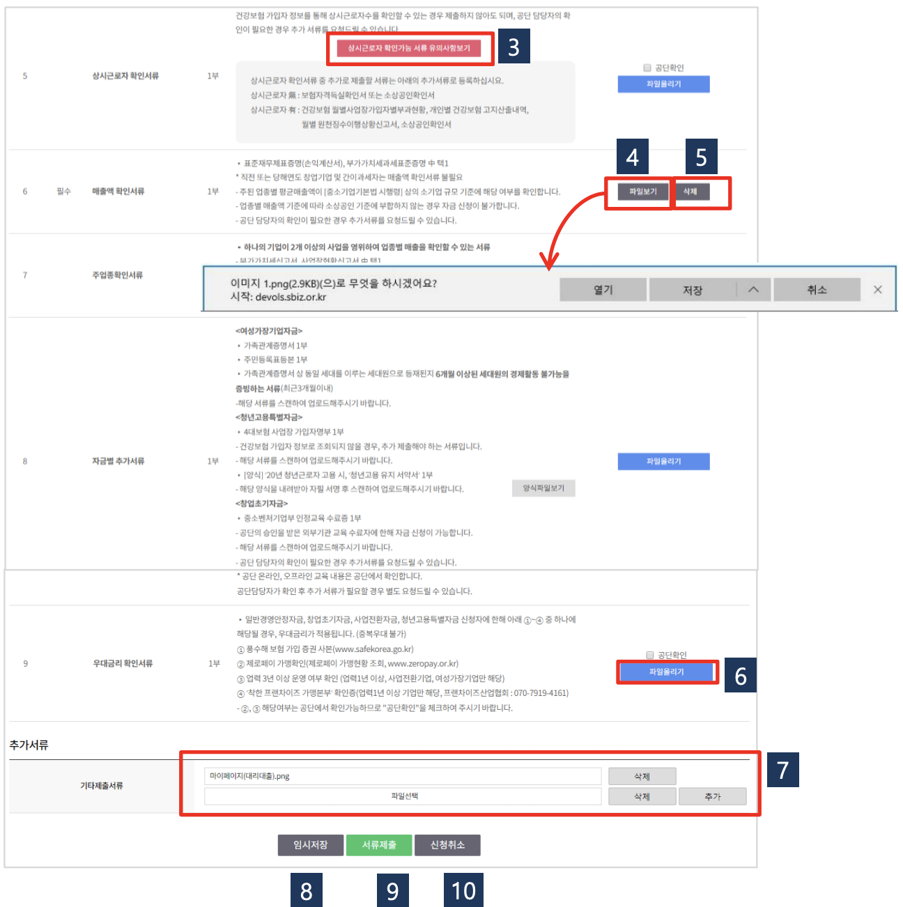 매출액 확인서류에서 [파일보기]를 선택하여 등록한 파일을 다운로드합니다. 작성 후 [파일올리기]를 통해 업로드 합니다. 이미 올라가 있는 경우 [삭제] 버튼을 누르면 다시 [파일올리기] 버튼이 보입니다.