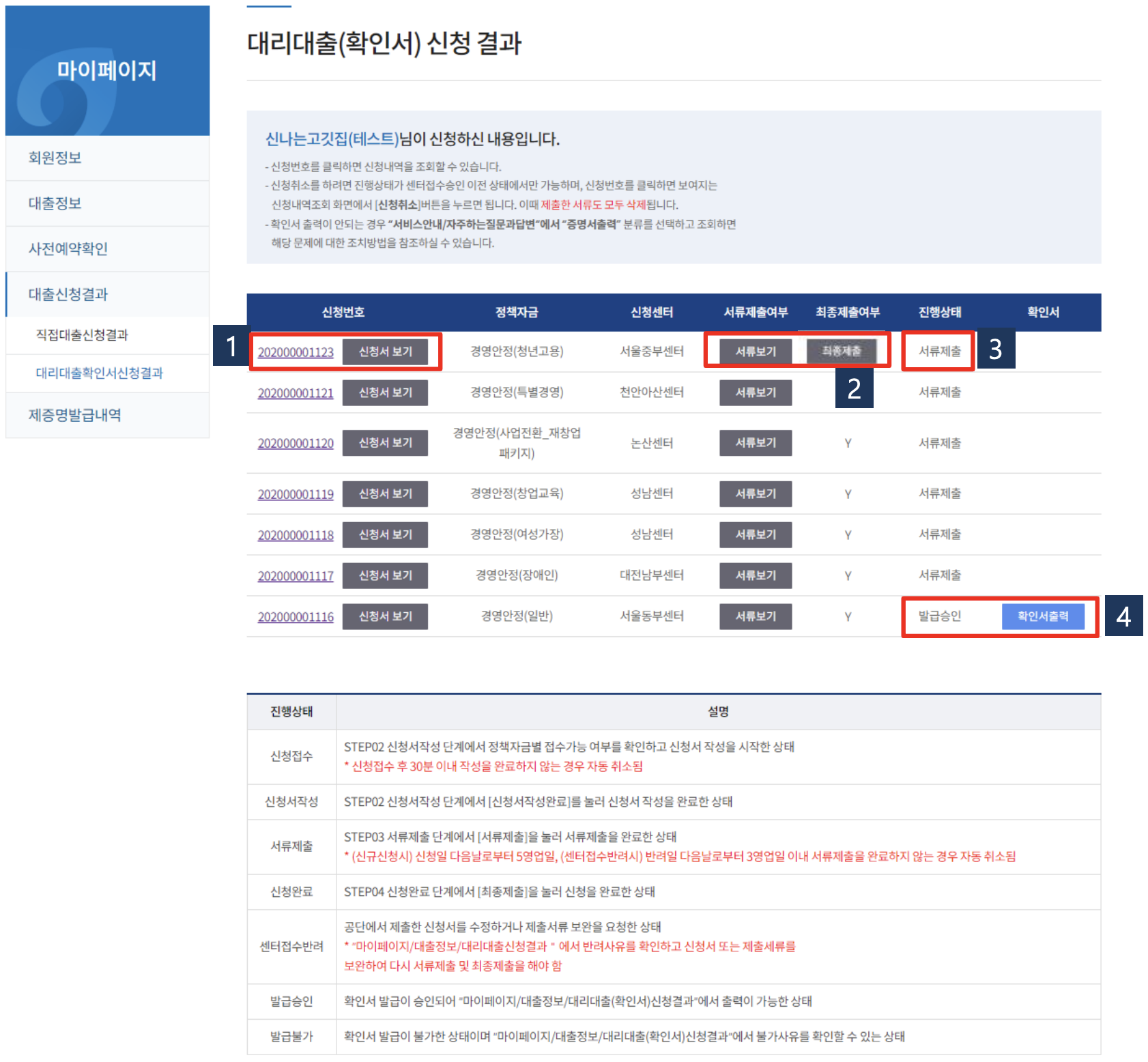마이페이지에서 좌측메뉴에서 [대출신청결과] - [대리대출확인서신청결과]를 클릭합니다.