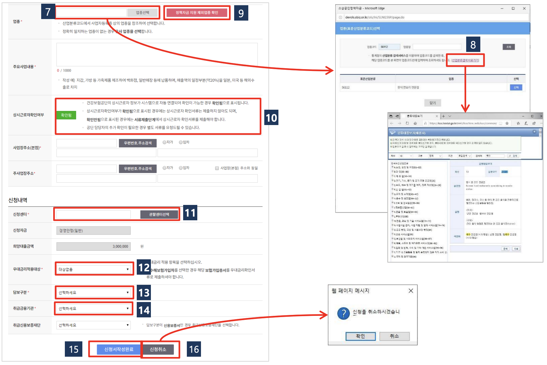 이후 [업종]의 빈칸을 클릭하여 산업분류의 업종을 선택합니다. 또한 [정책자금 지원 제외업종 확인]을 눌러 지원 제외 업종도 확인합니다.