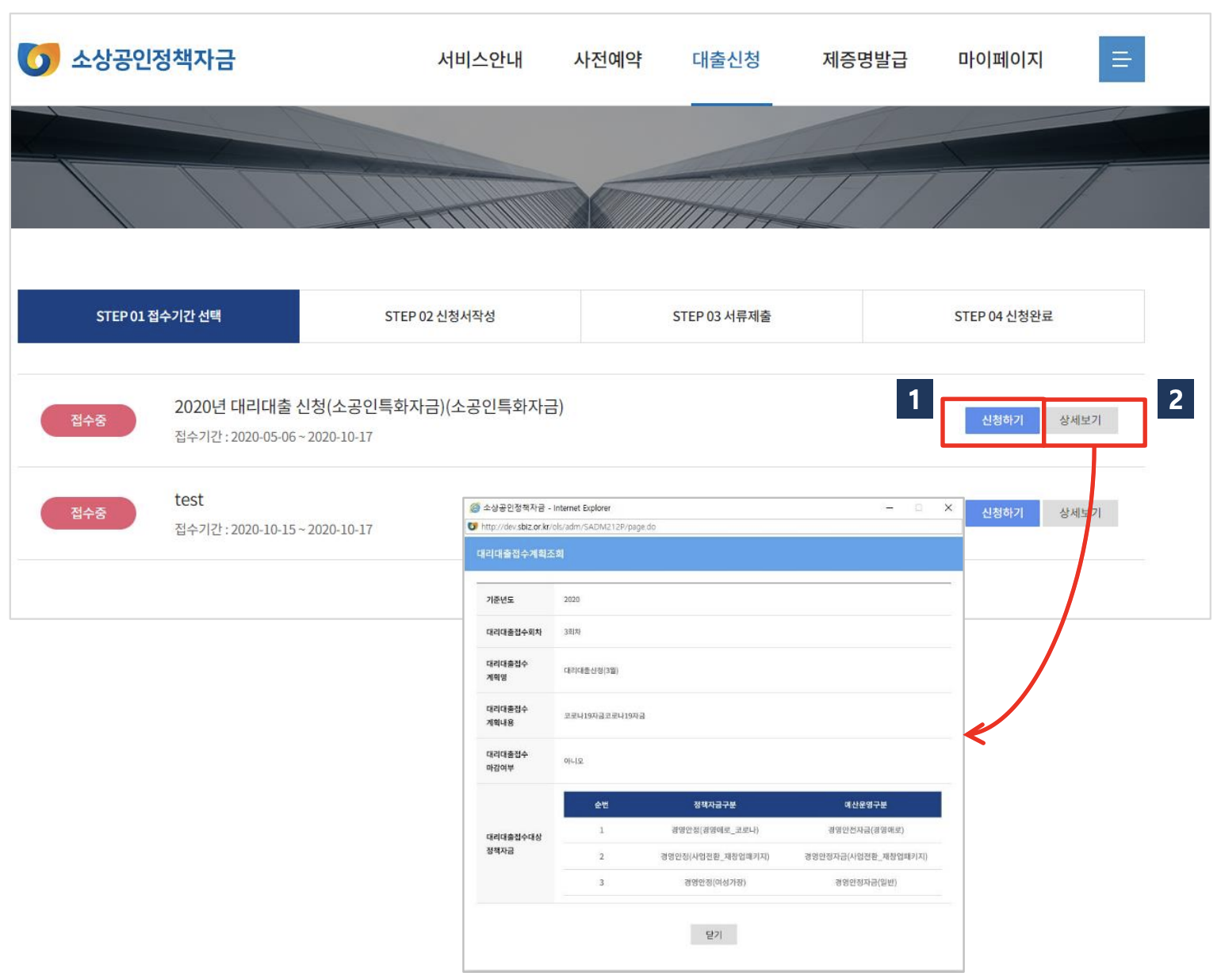 [상세보기]를 통해 대리대출 신청 접수기간의 세부정보를 조회합니다.