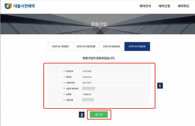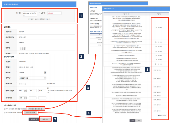 [예약신청내역(사업자)] 화면이 뜨면 30분 이내로 내역을 작성하고 하단의 [예약완료] 버튼을 눌러야합니다.
