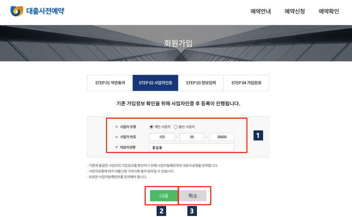 [사업자 번호]와 [대표자 성명]을 차례로 입력합니다.