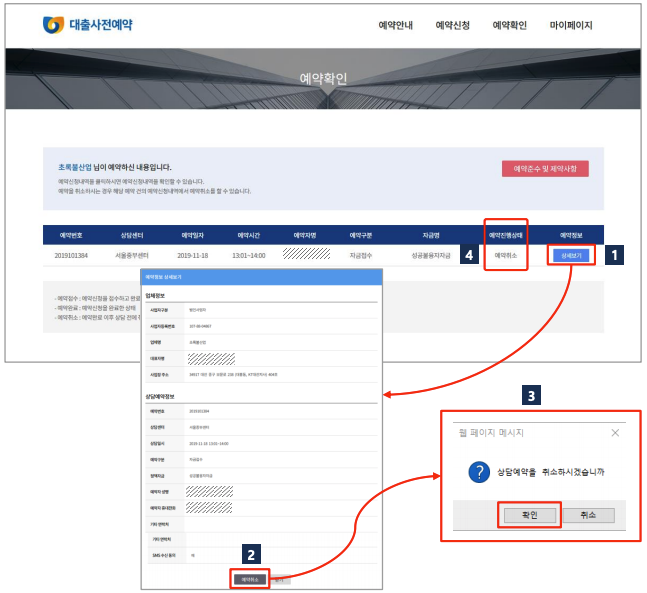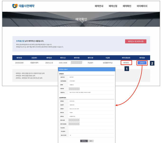 예약완료 및 확인 창에서 예약번호, 상담센터, 상담일시 등을 확인합니다.