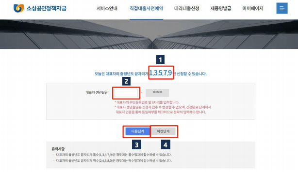 신청이 가능한 날이라면, 대표자의 생년월일을 입력하고 [다음단계] 버튼을 클릭합니다.