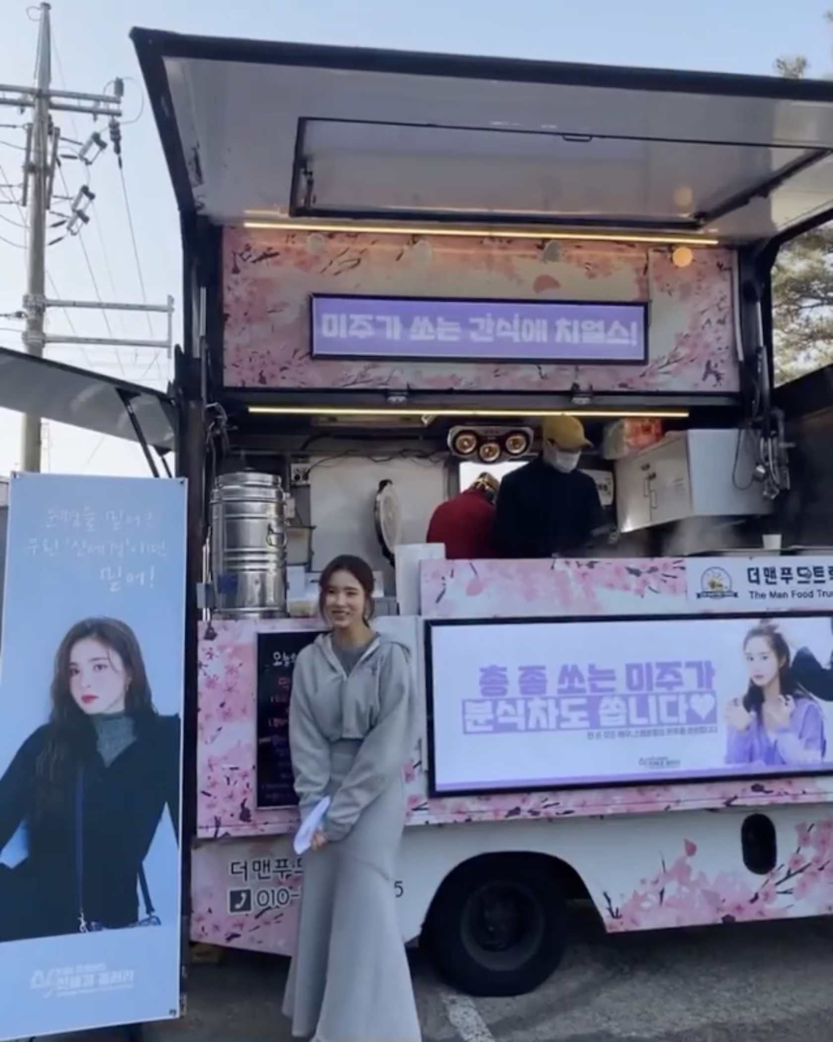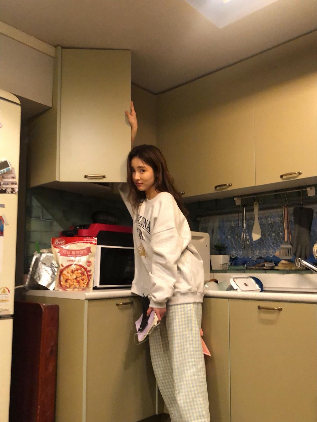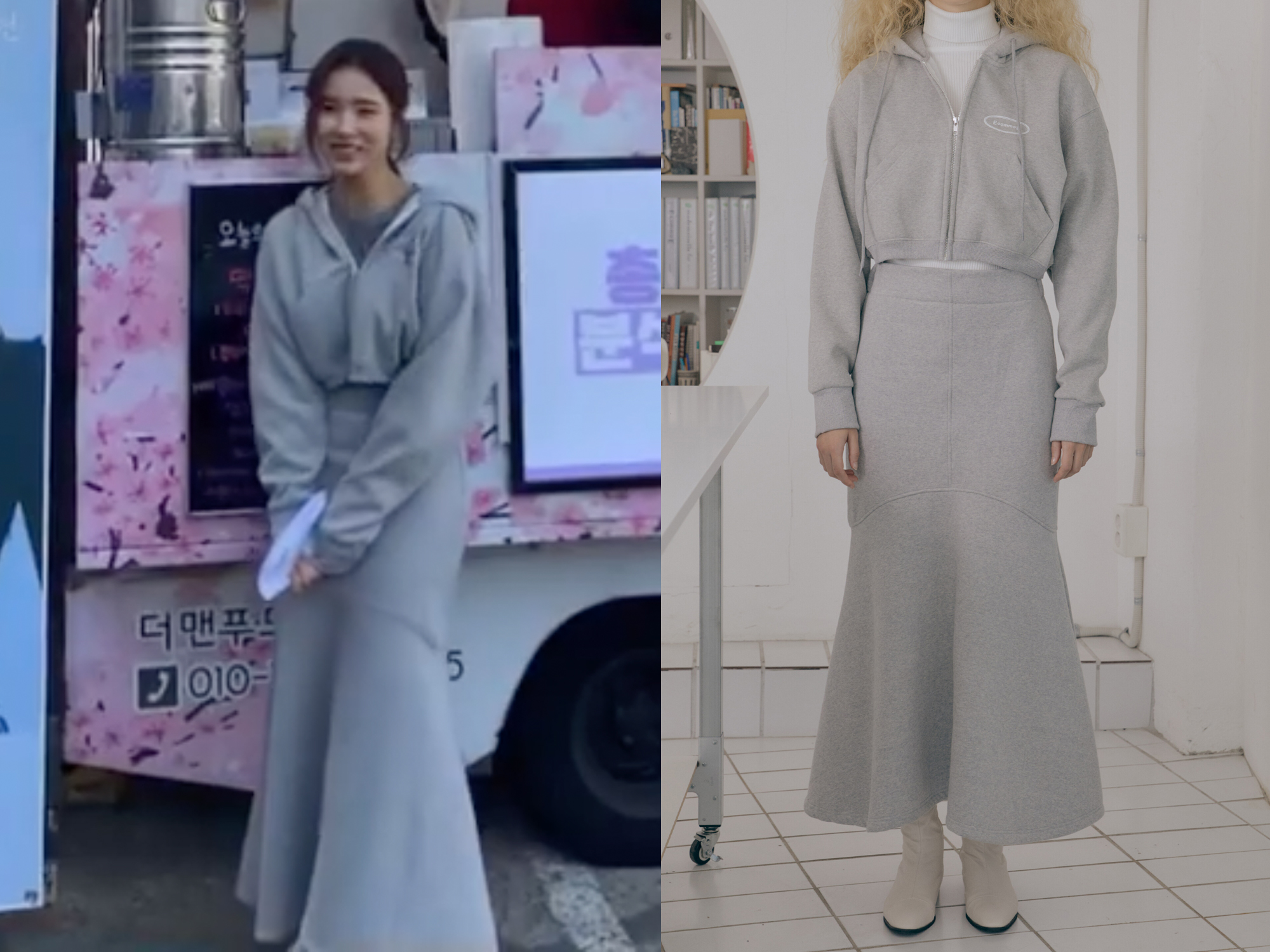 이 날 착용한 트레이닝 셋업도 참 예쁘죠. 크롭 후드집업+플레어 스커트 형태라 더 청순한 느낌이에요.