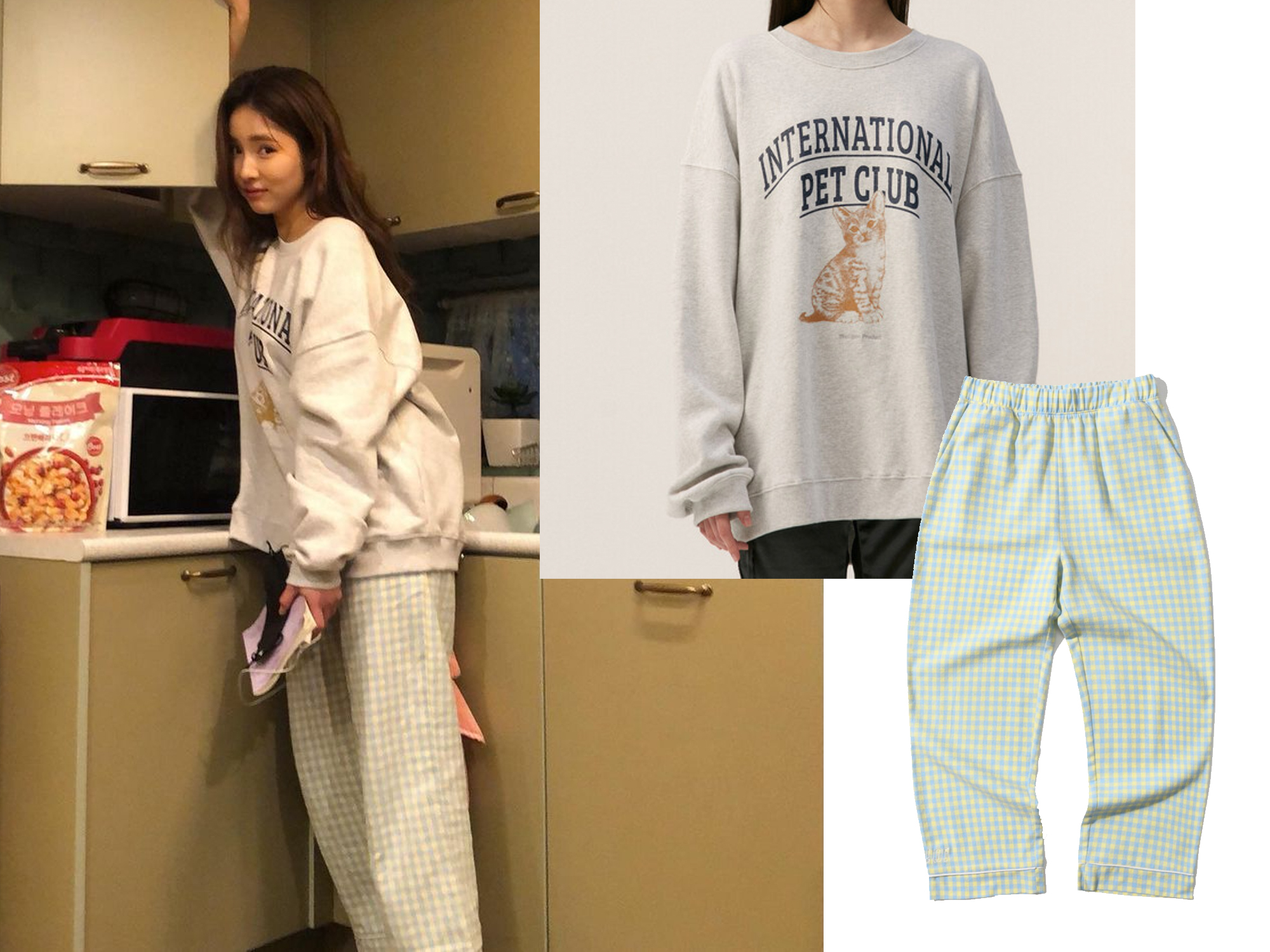 상의는 루즈핏의 맨투맨 착용했고 하의는 체크무늬 파자마 팬츠 입었어요.