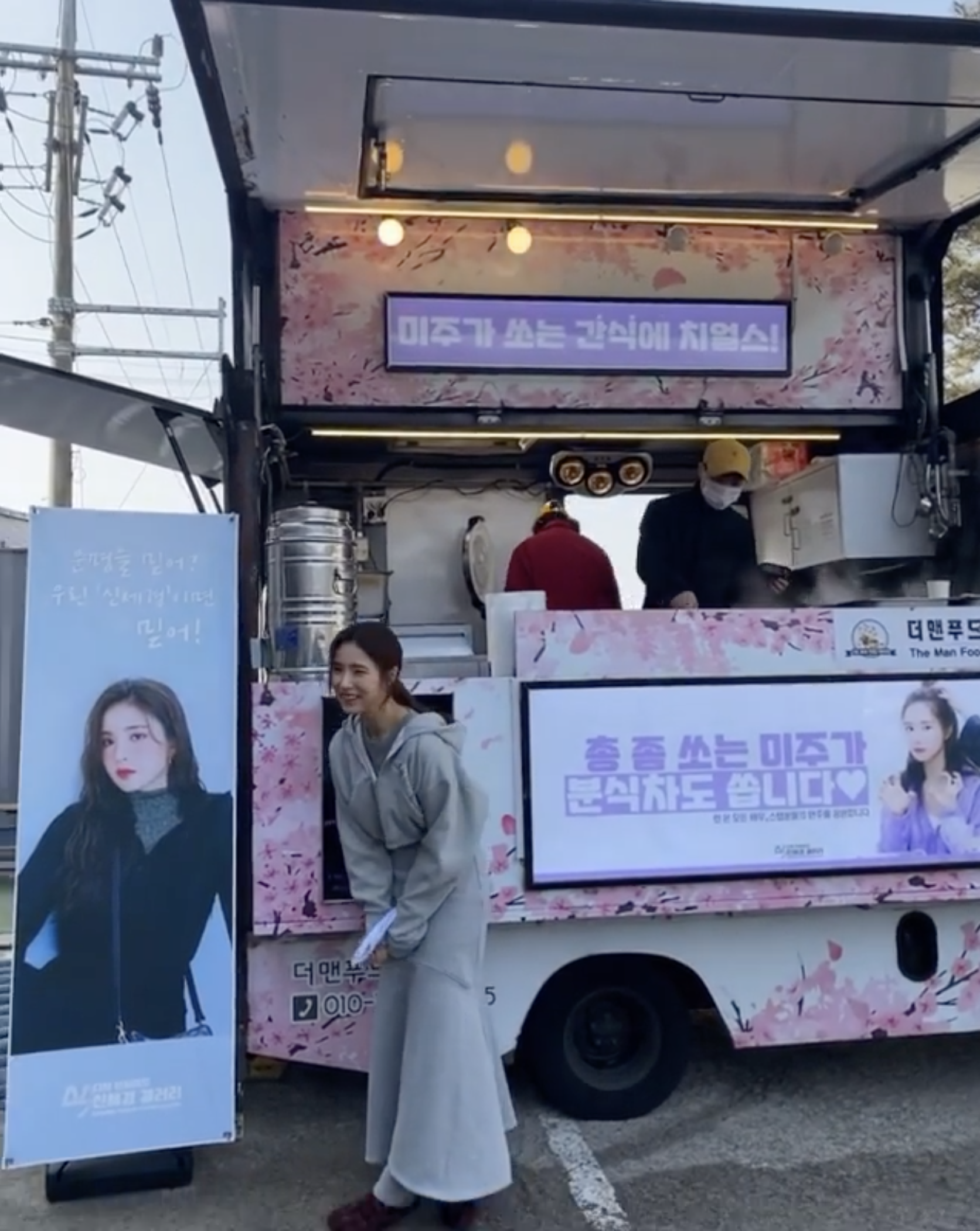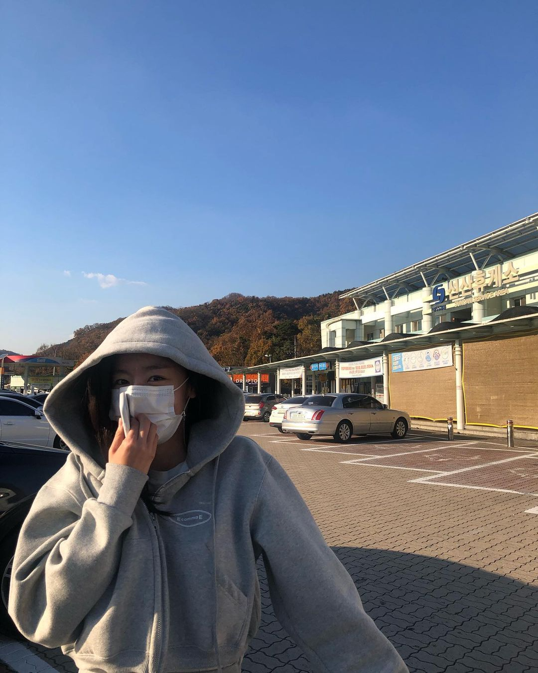 이 날 착용한 트레이닝 셋업도 참 예쁘죠. 크롭 후드집업+플레어 스커트 형태라 더 청순한 느낌이에요.