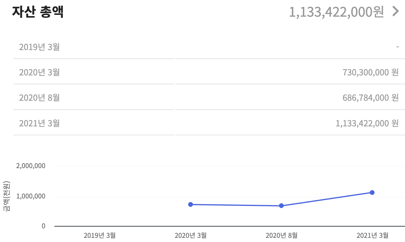 2021년 3월 기준 11억 3342만 2천원으로 신고됐다. 이는 전년도 대비 4억원 가량 늘어난 금액이다.