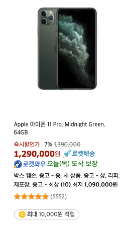 아이폰 11 프로 미드나잇 그린 64GB는 무려 7%나 즉시 할인은 하고 있어요!  묘하게 아름다운 색상이 눈에 밟히네요 ㅎㅎ